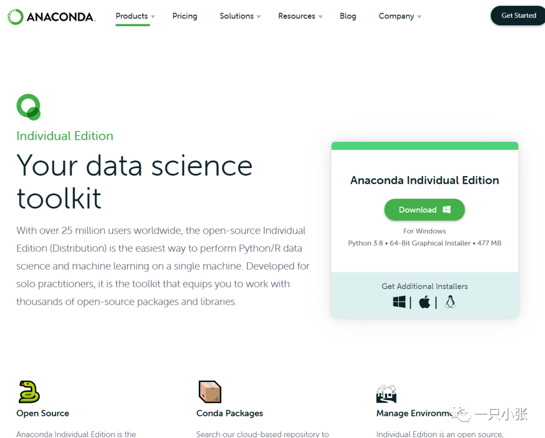 Anaconda的下载地址为https://www.anaconda.com/products/individual,虽然Python最新版本已经到了3.10,Anaconda还是使用了3.8的版本,3.8版本相对来说稳定性更好一些,对于一些库的支持也更加完善。点击Download下载。