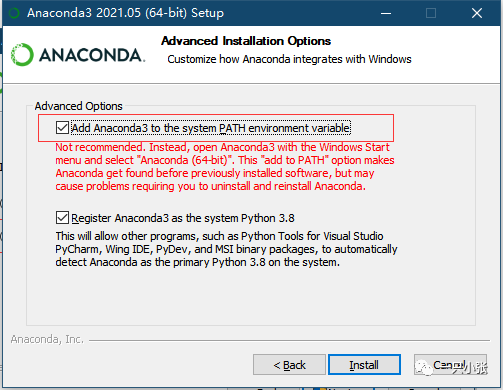 勾选将Anaconda3加入环境变量,和加入Linux的环境变量是一个道理哦~,点击【Install】