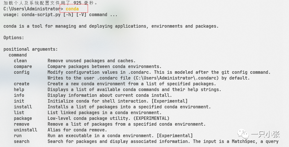 打开 cmd(WIN+R键,输入“cmd”),输入 conda,回车(可验证 Anaconda 是否安装成功)