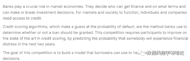 在自学数据分析和建模的过程中,很多小伙伴都希望能够寻找一些靠谱数据和项目练手,kaggle作为一个国际化的数据科学竞赛平台,可以说是小伙伴们试水的绝佳选择啦。小记就职于风控行业,接触最多了解最深的就是风控行业的数据分析及建模流程,所以本次特地选取了kaggle平台上的经典案例give me some credit,基于这个案例进行数据清洗、数据预处理、特征筛选、特征分箱、模型训练、模型评估和评分卡映射一系列的实操试验,并且持续分享在公众号里哦~