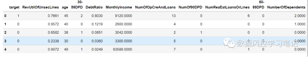 # 查看尾部两行data.tail(2)# 查看&重命名列data.columnsdata.drop(columns='Unnamed: 0',inplace=True)column = ['target', 'RevUtilOfUnsecLines', 'age','30-59DPD', 'DebtRatio', 'MonthlyIncome','NumOfOpCreAndLoans', 'NumOf90DPD','NumReaEstLoansOrLines', '60-89DPD','NumberOfDependents']data.columns = columndata.head()