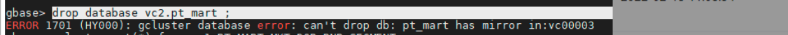 若显示库的镜像库存在,则需要解除镜像库关系,命令:alter database vc2.pt set default mirror=null;