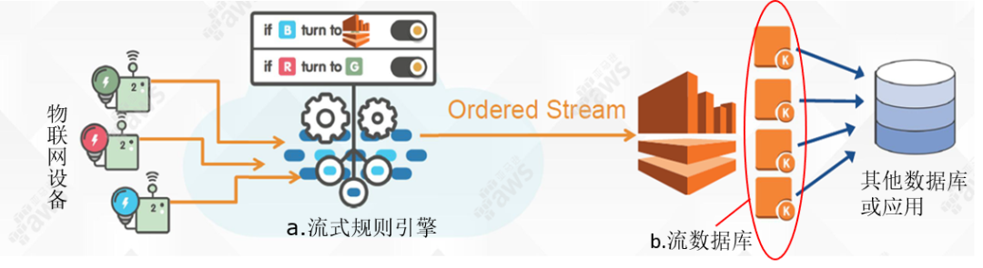 从上图我们可以看到,数据经采集后通过a流式规则引擎来进行过滤、转换、汇总后,发送至亚马逊Kinesis处理实时流式数据;再通过b流数据库将流式数据的实时处理结果导入至存储数据库、应用或其它亚马逊服务。