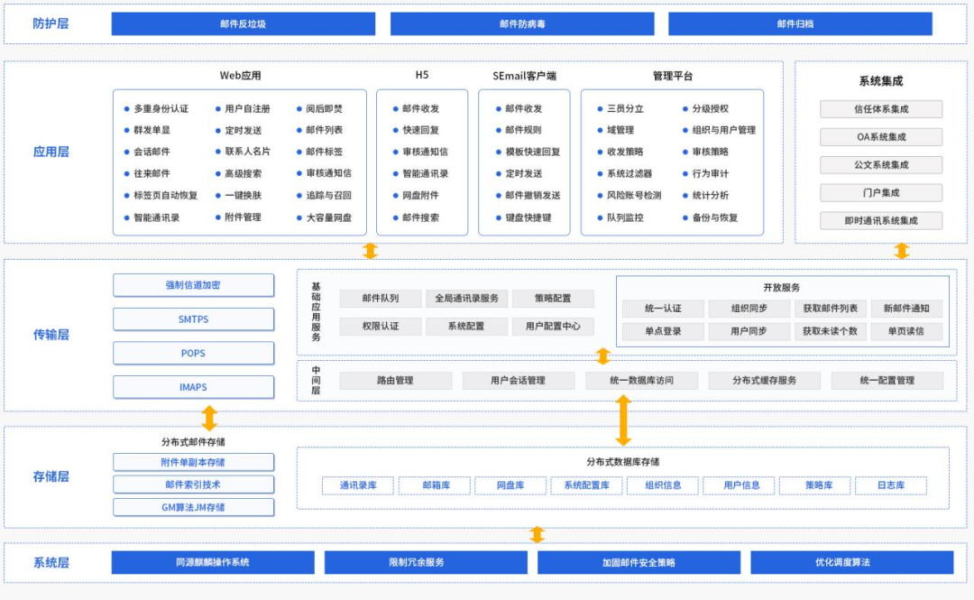 • 该邮件产品与麒麟操作系统同源开发,高度适配。麒麟操作系统的优化,从根本上提升了邮件系统负载能力和处理速度。