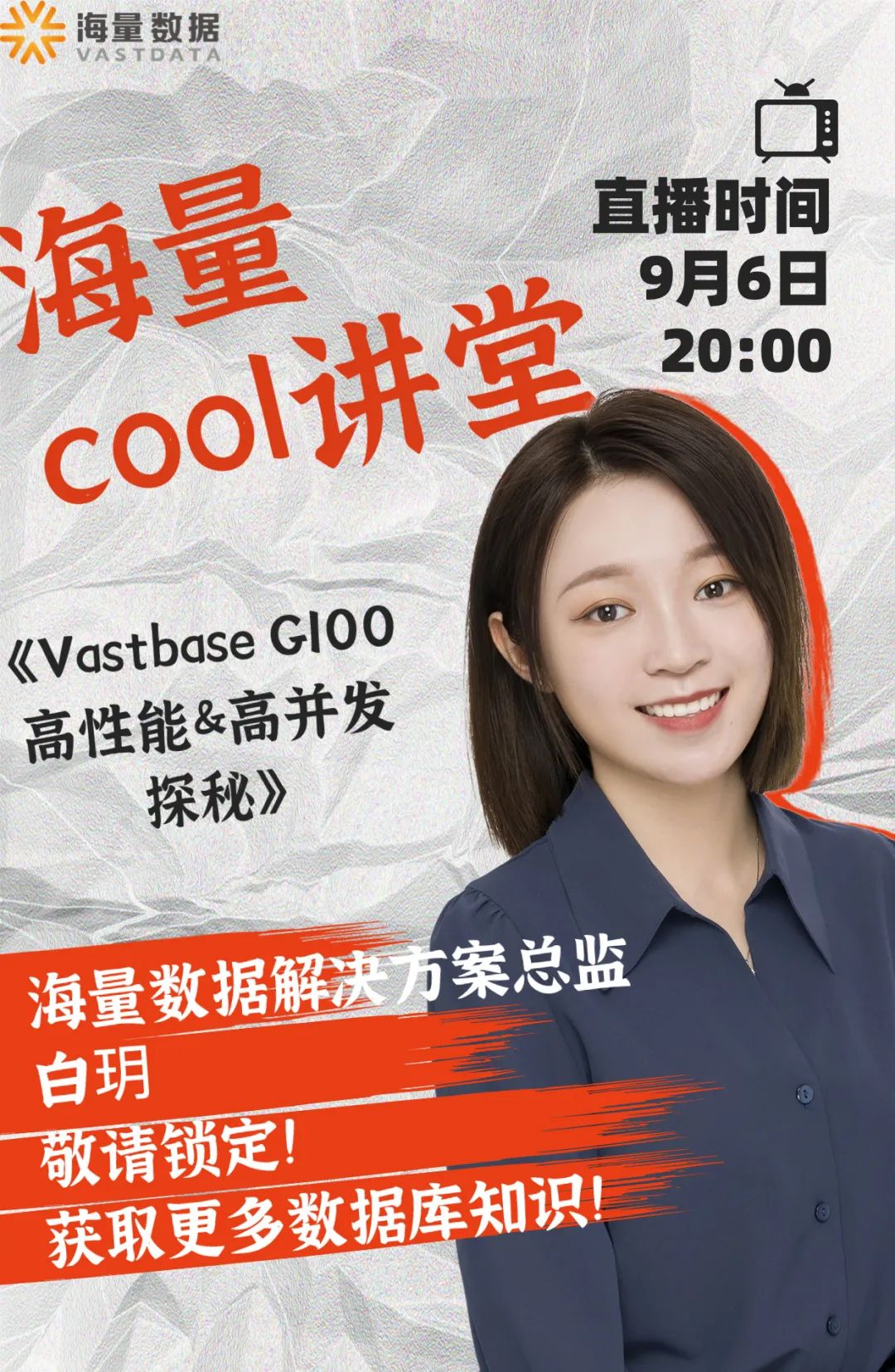 9月6日20:00-21:00,锁定海量数据视频号直播间,带您走进海量数据库Vastbase G100。
