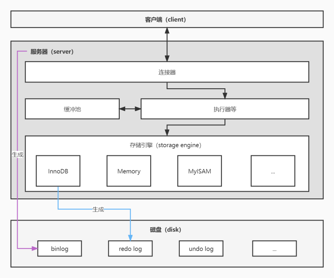 存储引擎是 MySQL 中直接与磁盘交互部分。页是存储引擎读写数据的最小单位,一个页里可以有一条或多条表记录。MySQL 中的存储引擎有很多种,比如 InnoDB、MyISAM、Memory 等。其中最常用的是 InnoDB。而 InnoDB 是 MySQL 中唯一能够完整支持事务特性的存储引擎,也是一个高性能的存储引擎。本文要讲的「两段式提交」就发生在 InnoDB 中。