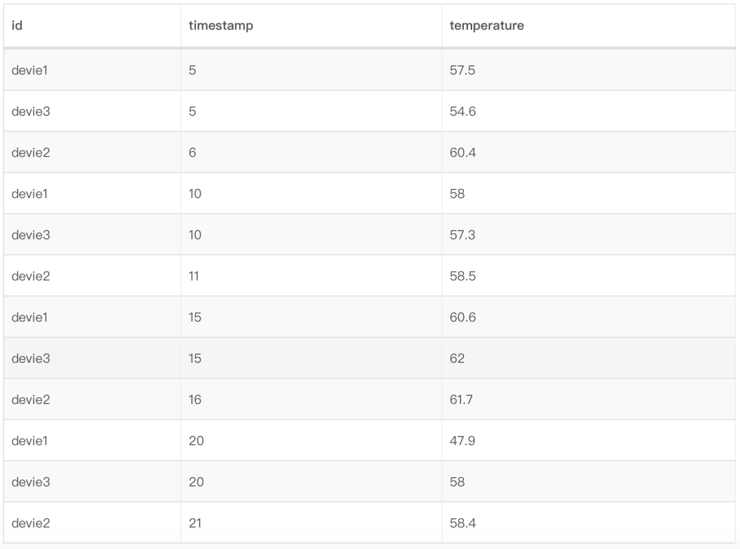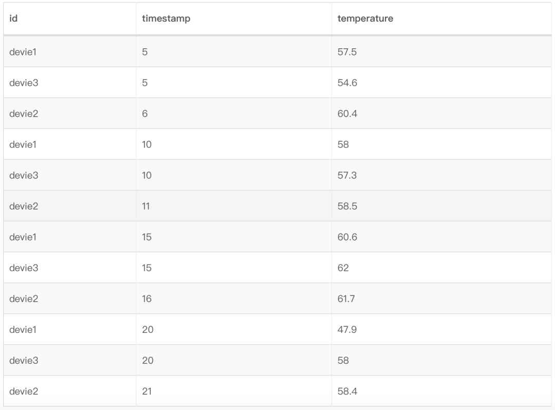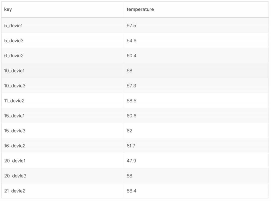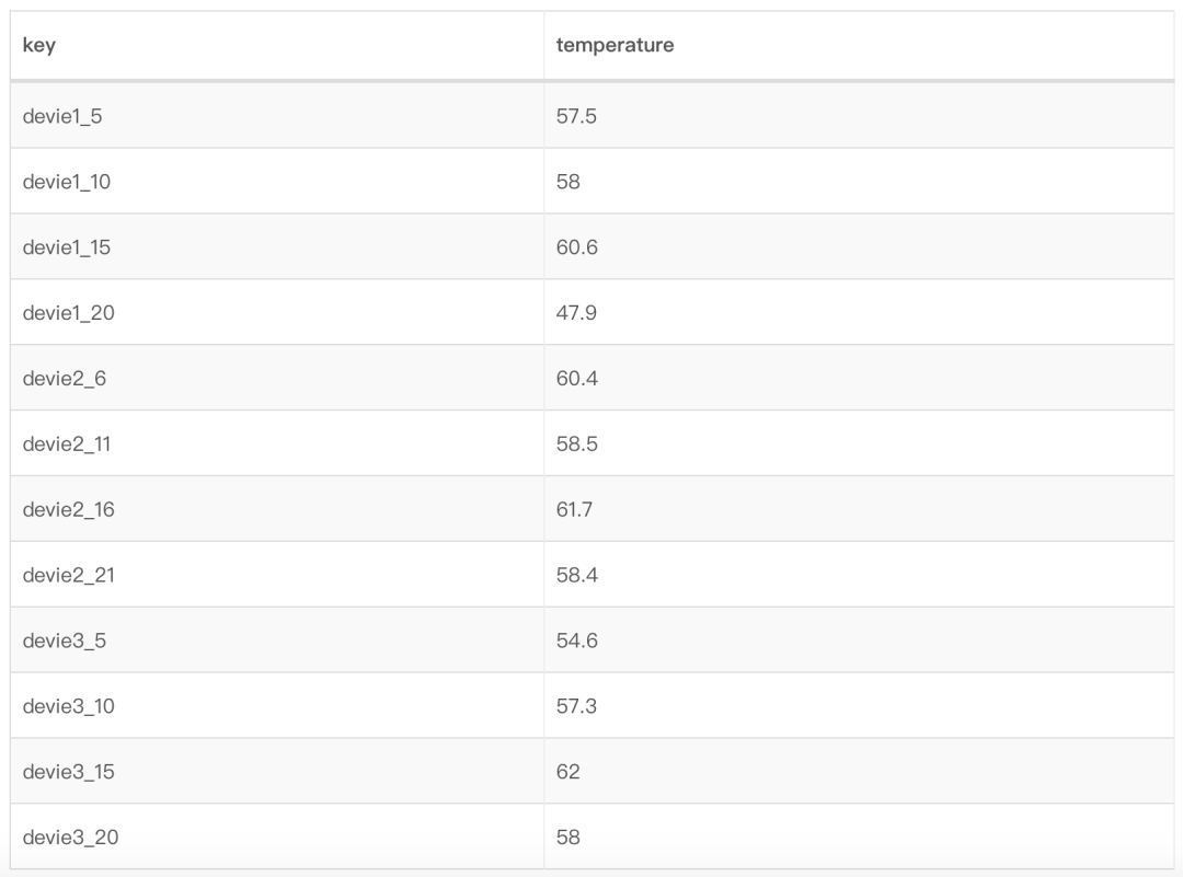 考虑如下场景,某工厂的供热系统有3个供热设备(device),每个设备有1个测点,每个测点每5秒钟会采集当前时刻的水温(temperature)并且上报,用来实时调整供热系统的水温以达到安全状态。管理员会有如下两种查询需求: