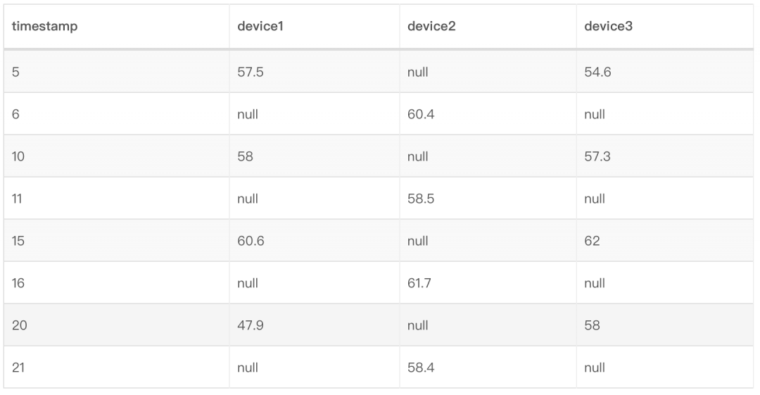 如果以每个device分别作为列名,列值存储温度值,按照timestamp有序存储呢?建模如下所示: