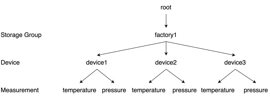 拿上面的例子做一下说明,比如某工厂是factory1,则存储组是root.factory1,root是系统保留关键字;设备有3个,分别为device1,device2,device3;每个设备目前只有1个测点就是temperature,则会产生3条时间序列并且其代表的意义如下所示: