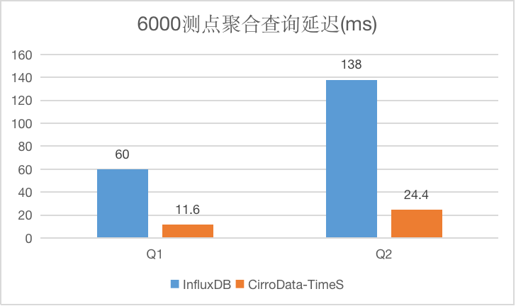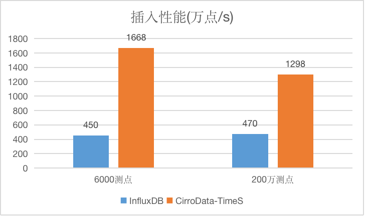 通过下图可以看到,不管是在6000测点还是在200万测点的情况下,CirroData-TimeS的性能都要远远高于InfluxDB。