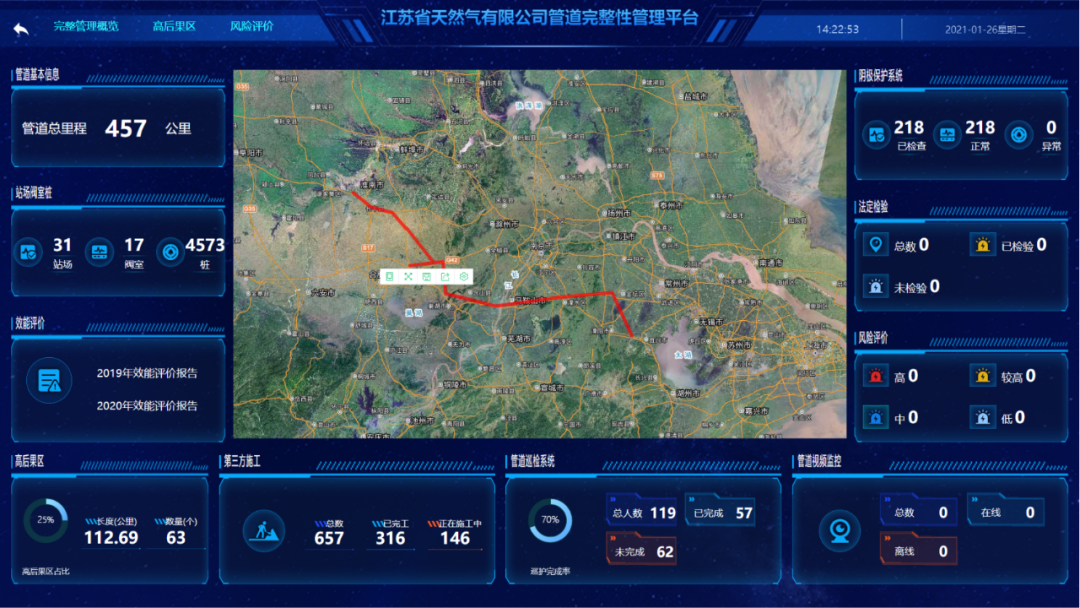在江苏省天然气有限公司概览、管道完整性管理、高后果区管理、风险评价管理大屏上,管理者全面知晓天然气生产、经营、管道概况,异常关键指标实时预警,为精准决策提供大数据支撑。