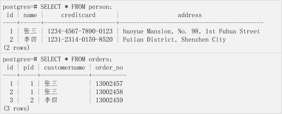 准备两张包含敏感字段(creditcard、customername)的表。