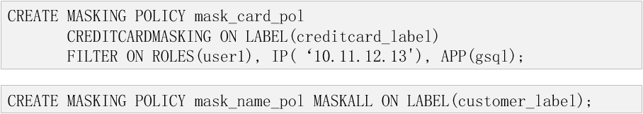 脱敏策略mask_card_pol:只有当用户“user1”在‘10.11.12.13’ip上使用gsql访问表时,标签creditcard_label中的列将按照‘creditcardmasking’方式脱敏。 脱敏策略mask_name_pol:默认对于所有查询用户,标签customer_label中的列将按照‘MASKALL’的方式脱敏。