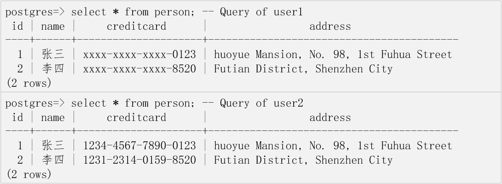 而无论对于user1还是user2用户,他们查询order表时都会触发脱敏策略mask_name_pol,因此customername字段将会被脱敏处理。