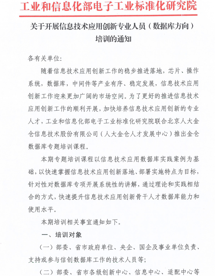 近期,在电子标准院公布的电子信息领域人才培养合作单位名单中,人大金仓凭借自身丰富的人才培养实践经验和深厚的技术底蕴成功入选培训合作企业。