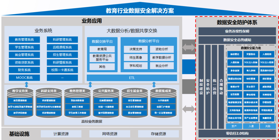 以保障业务连续性为前提,在做好教育数据安全防护的基础上,加强制度体系建设、数据安全整体态势感知能力和统一运营能力。