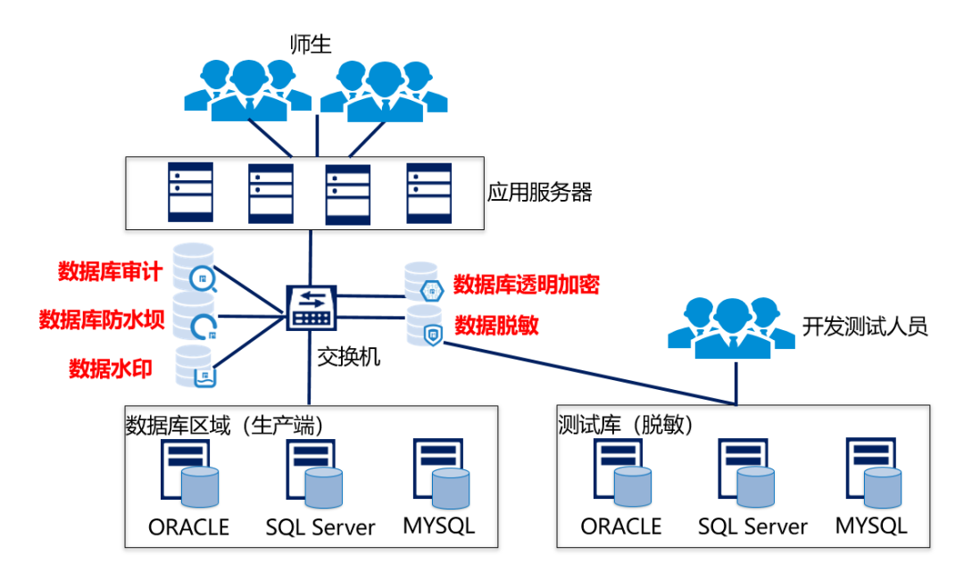 以国家和地方的相关政策为指导,以《数据安全法》等法律法规为标尺,美创从数据安全内部管控、数据流动安全、勒索病毒防御、数据存储安全等场景出发,通过数据库防水坝、数据脱敏系统等产品建立起多层次、立体化的高校数据安全防御体系,全方位保障学校数据资产安全,为数据交换共享和上层应用提供安全保障。
