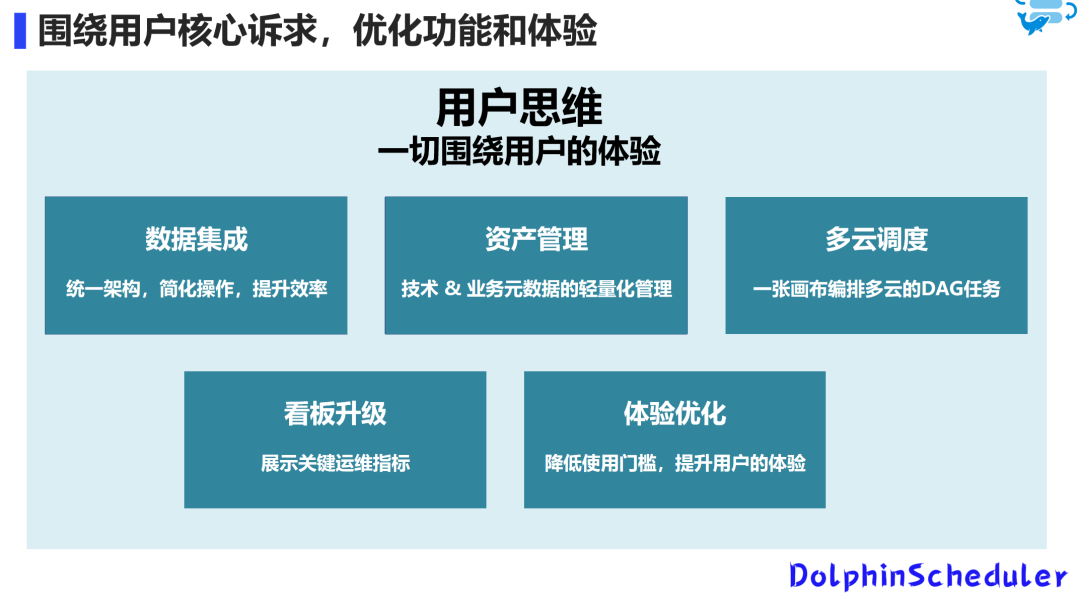 在引入 Apache DolphinScheduler 之前,我们在调度和数据集成的场景中,整体的技术架构是不统一的。为了满足我们内部的刚性需求,同时从扩展性、稳定性等维度考量,我们计划建设统一的调度&数据集成服务体系。在调研了大量调度产品后,我们决定基于 Apache DolphinScheduler 作为我们的核心引擎,并在此之上进行本地化的改造,去满足我们的需求。在技术资源有限的情况下,去发起一个工具产品的研发并不容易,我们要思考清楚:谁是我们的核心用户?这个工具产品的核心定位是什么?支撑的场景有哪些?经过充分的调研,我们明确了这个工具产品的核心定位,他不是一个简单的工作流调度平台,是满足伊利多云业务场景的一体化数据开发平台,同时,以一个轻量化的工具,面向数据、应用开发人员,支持内外部的数据集成、应用侧分布式调度需求、以及数据任务的可视化编排和调度。从伊利目前的应用情况来看,日调度任务数达到了 1.3 万个,集群规模 15 个节点,每日搬迁表8000+。从上面的架构图可以看到,我们在多云大数据基础设施之上,构建了一个统一的数据集成、开发、调度和运维的数据平台,通过这个平台,去屏蔽多云大数据平台的差异性,为用户提供统一的开发体验。我们对 2.0.2 版本的 DolphinScheduler 的整个模型做了重新抽象,项目作为最顶层的模型,同时抽象了资源、角色、工具三个概念,并绑定到项目里。其中工具集合是最重要的,所有数据开发过程中会用到的工具都会在这里去扩展,用户在平台内通过授权项目,即可完成数据集成、开发、运维、资产管理等工作。同时,我们将 Apache DolphinScheduler 的租户与大数据平台租户做了融合打通,通过大数据平台侧 Ranger+Ldap+Kerberos 的租户管理体系完成资源配额、权限的细粒度管理。我们基于 Apache DolphinScheduler 2.0.2 版本做了三次迭代,迭代了很多的功能,但是有一个主线逻辑贯穿我们的产品设计和研发过程,那就是以满足用户的核心需求去建设新功能,以提升用户体验去优化旧功能,让产品上手容易、低门槛、平民化、动线合理。何为面向场景的数据集成?我们的产品完全开放给用户使用,开发人员在做数据集成时,有非常明确的上下文,比如把 Mysql 的数据同步到 Hive,把 ES 的数据同步到 StarRocks 等。所以,我们提供了大量的集成组件,可以基于配置化的方式,完成集成的工作。全过程 0 代码,提升了数据集成开发的效率。在未规划数据集成的核心功能前,我们面临着以下几个痛点: