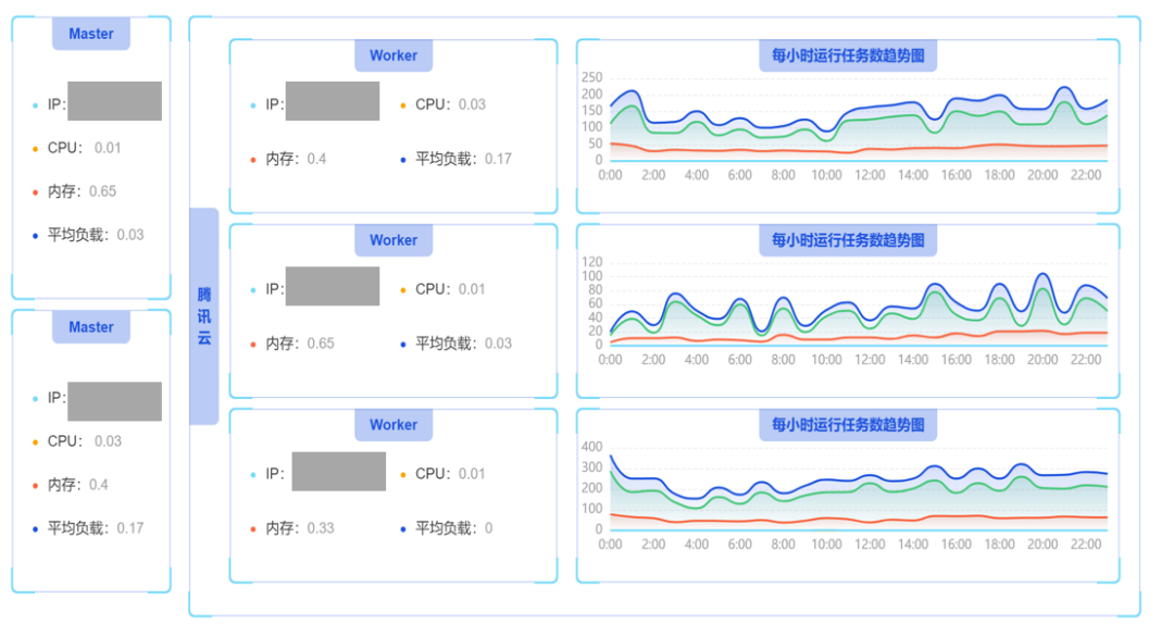 这个功能所对应的核心诉求是这样的,应用基于原生大数据能力去构建轻量化数仓时,需要去清晰的洞察技术元数据信息,包括库、表、字段、基础属性信息,同时,需要对表打一些业务标签信息,包括主题域、主题等,方便分析人员使用数据,基于这样的诉求我们在平台上扩展了这个轻量化的资产管理功能。正逆向建表是核心功能,正向建表是指支持用户在平台上创建表模型,并将表模型物化到大数据平台上。而逆向建表用的更多,很多时候用户还是以传统的开发方法, 通过ETL服务器上写脚本,提交到大数据平台上做计算,这个时候表已经提前存在了,而不是通过可视化的方式创建的,那逆向建表就是自动扫描元数据,并注册到资产平台上。资产检索是面向开发和业务分析提供了资产检索的功能,可以按照主题域、标签、字段名等进行轻量化检索,展示资产卡片和上下游血缘信息。多云任务调度是为了解决跨云平台的一体化调度问题,如前边所讲,伊利的应用多云分布,而这个功能可以基于一张画布完成跨云任务编排,我们基于 Apache DolphinScheduler 做了一些扩展改造,灵活运用环境与 worker 组的绑定关系,同时大数据基础设施侧解决 Kerberos 跨域、多集群 Keytab 互信的问题。如示例所示,我们可以在不同的云上分别触发数据集成的任务,包括数据处理任务。处理完成之后,在另外一朵云上触发数据计算和面向业务应用的计划编排,最后提供数据服务,通过这种方式实现多云调度。我们在原有 Apache DolphinScheduler 看板的基础上,做了优化和升级,面向运维侧,构建了运维工作所关注的核心指标,并将指标做了可视化展示。对于任务监控,我们设计的关键指标包括项目数、工作流(上线/未上线)、应调度任务数、已成功调度任务数、分小时运行情况概览、运行失败统计 TOP5、运行时长统计 TOP5 等。对于服务监控,关键指标包括 CPU、内存、平均负载、各云环境 worker 负载,分小时 worker 运行情况概览等。接下来是体验上的升级优化,比如用户定时配置步骤优化,整体布局优化等。核心的出发点还是优化用户的使用体验,降低使用门槛。最后是我们团队关于 DolphinScheduler 的未来规划。从长远来看,不管是社区,还是我们公司内部,都需要对于 DolphinScheduler 有一个清晰的定位,即它不是一个简单的工作流调度平台,而是一个一站式的智能数据开发平台,这个数据开发平台至少具备三个重要的特点:- 多云统一:可以与去中心化的新型数据架构完美契合,这是一个非常重要的方向;