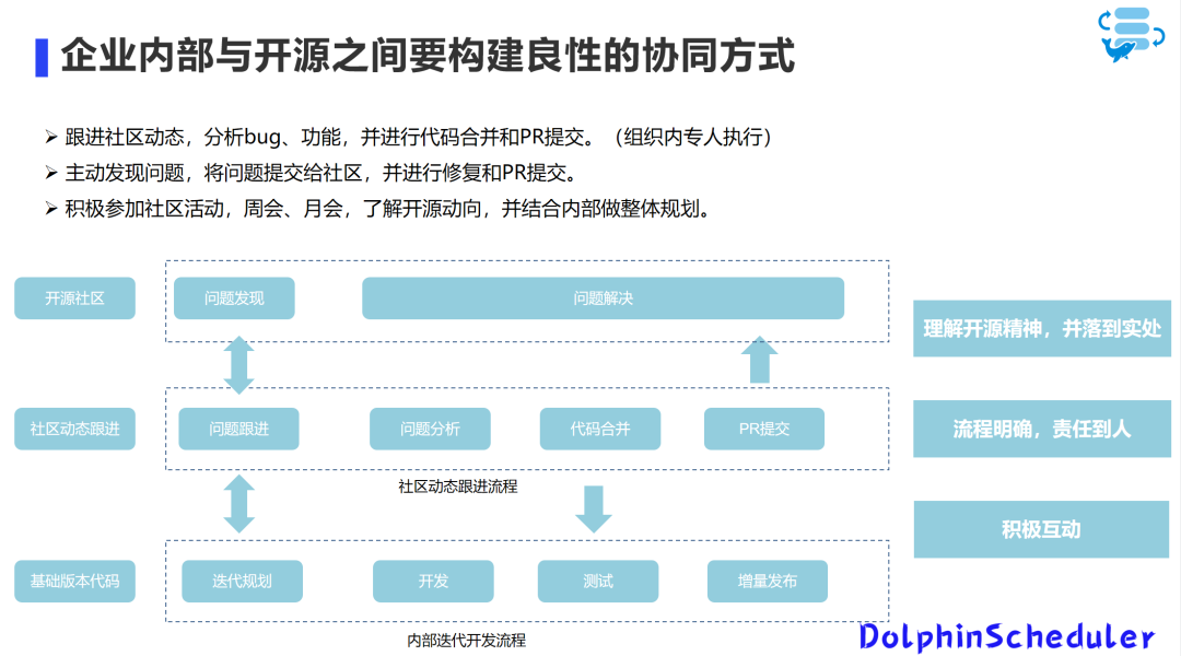 伊利引入 DolphinScheduler,与开源产品共同成长。在这个过程中,我们有了一些关于协同的思考,企业内部与开源之间要构建良好的协同方式非常重要。我们内部会指派专人跟进开源社区的动态,研发团队会主动发现 Bug 并提交给社区,并修复后提交 PR。同时,我们也会积极地与社区互动,通过周、月会查看社区动向。对于技术研发资源有限的企业,应该去找一个契合企业内部实际使用情况的开源产品,要真正理解并把开源精神落到实处。开源的力量非常强大,可以解决很多内部根本无法解决的问题,也会发现内部不会发现的问题。所以,企业内部需要把参与开源的流程落到实处,与社区共同成长。