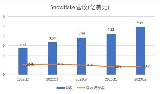 美国云数据仓库公司Snowflake第二财季总营收为4.972亿美元,与去年同期的2.722亿美元相比增长83%,超出分析师预期。虽然如图1所示,该公司营收同比增速有所放缓,但整体来看,其营收仍然呈爆发增长趋势。据了解,公司94%的收入都来自于数据云产品,6%来自专业服务。