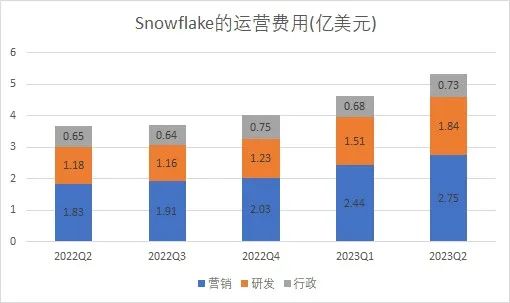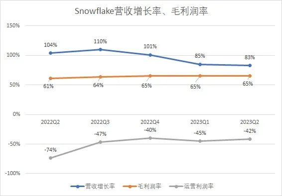 此外,Snowflake的毛利润率和运营利润率也呈现增长趋势,其中,该公司毛利率已连续三个季度保持在65%,产品毛利率从2021财年69%增长至当前72%的水平,并连续三个季度维持在该水平。然而,该公司的运营费用支出较大,这也是造成亏损的主要原因。