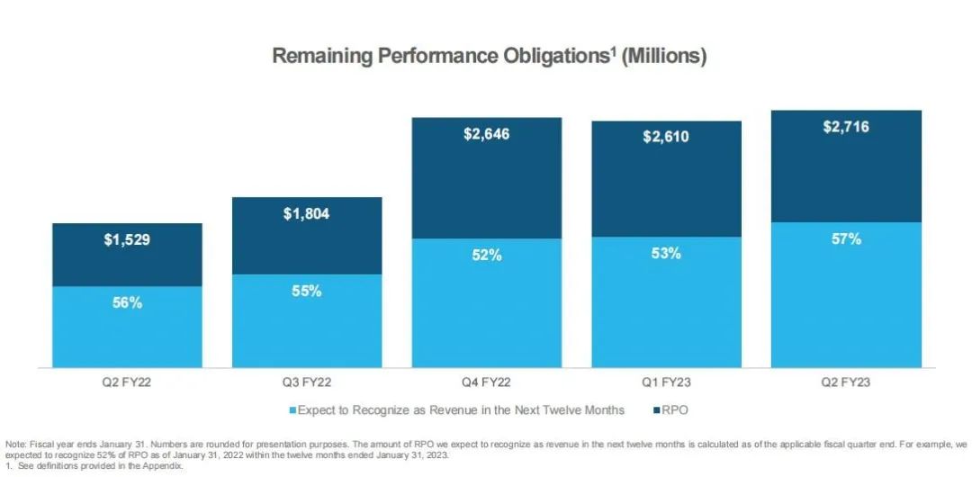 如上文所述,Snowflake的运营费用支出较大是造成该公司亏损的主要原因。此外,剩余履约义务也是造成该公司亏损的重要原因,而该原因跟会计准则有关。据了解,根据会计准则,客户提前预付了一年的费用,但云计算服务提供商尚未完全提供其产品服务,那么该收入将被计作递延收入(Deferred revenue,本质也就是Liability),然后被分期到未来的一年中,直到将服务提供给客户。