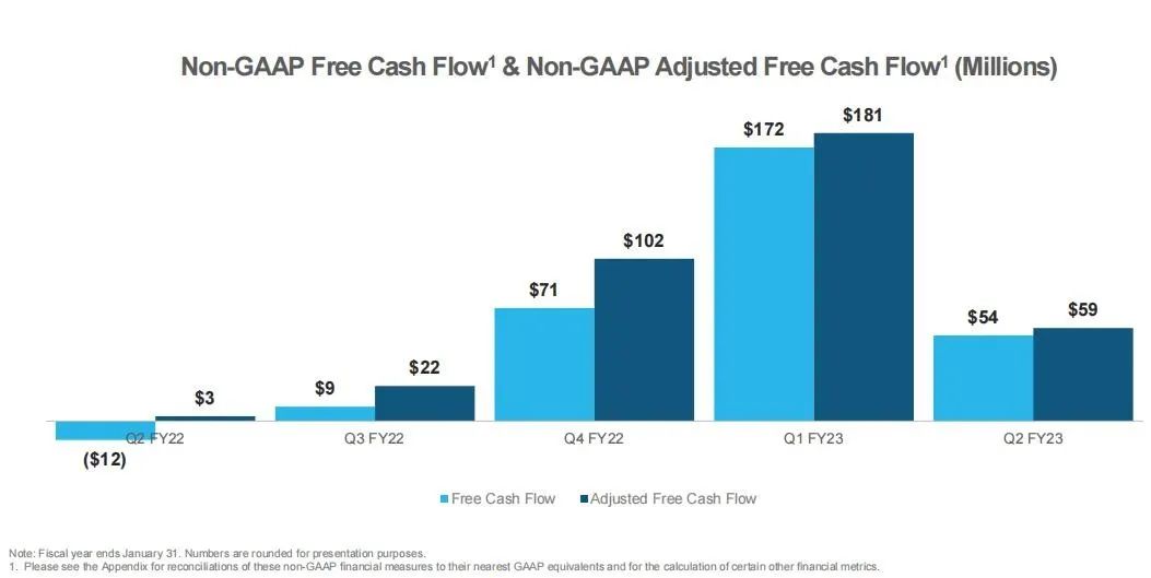 此外,整体来看,在2023财年第二季度,Snowflake的运营利润率已从上年同期的-74%收窄至-42%,不仅如此,该公司还提高其全年调整后运营利润率至2.0%,该公司先前预计为1.0%。