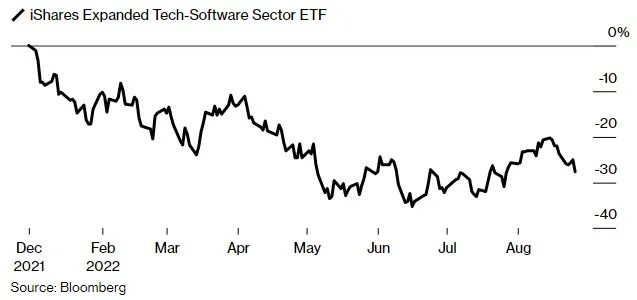 由下图可见,由于需求疲软和情绪恶化,科技-软件行业今年下跌27%。
