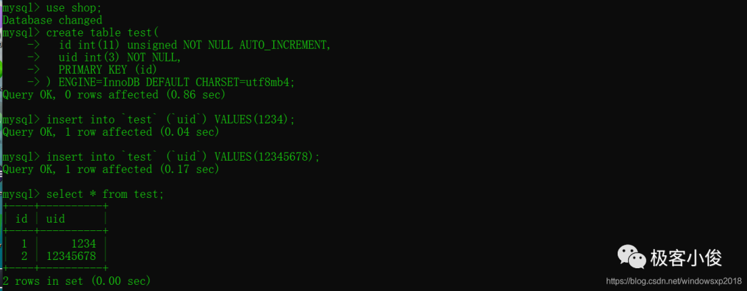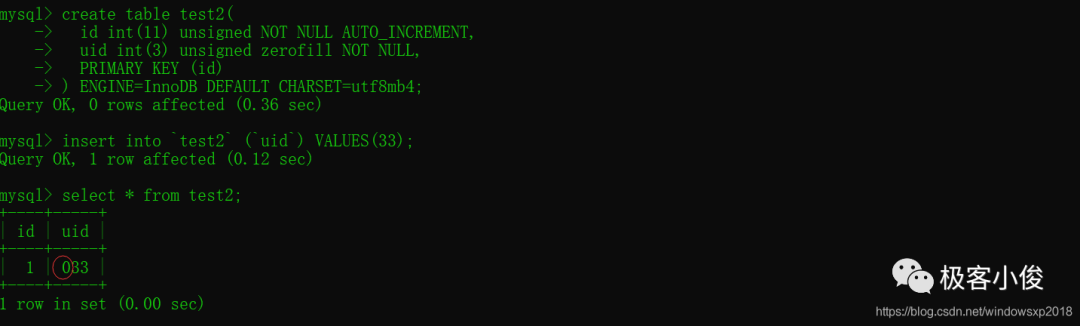 那么我们可以从新来建立test2表, 然后这一次我们把uid字段加上: unsigned 和 zerofill 这两个字段约束。