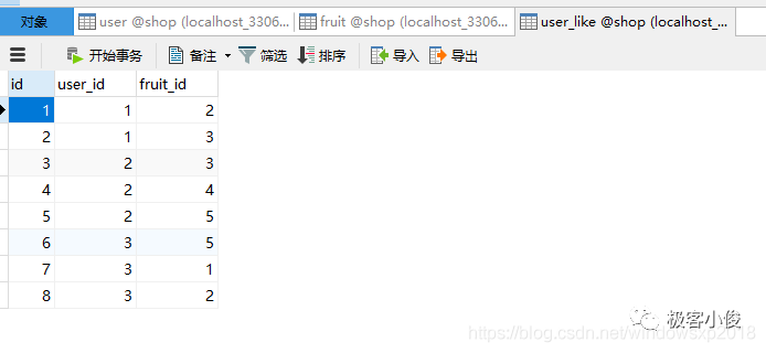 我们再结合group_concat()函数来做一个多表查询的案例 。准备三张测试数据表: 用户表[user]、水果表[fruit]、用户喜欢哪些水果的表[user_like]。