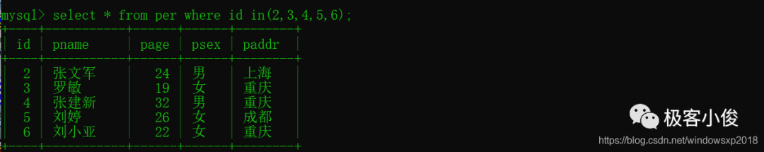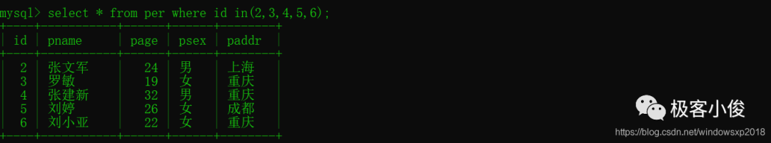 select * from per where id in(2,3,4,5,6); #--正确的