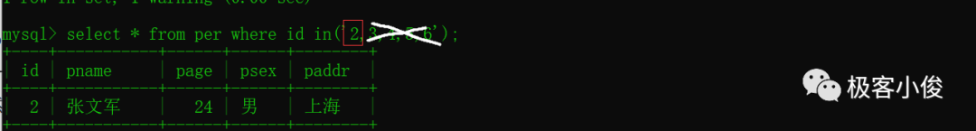 select * from per where id in('2,3,4,5,6'); #--错误的