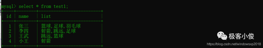 INSERT INTO `test1`(name,list) VALUES ('张三', '篮球,足球,羽毛球');