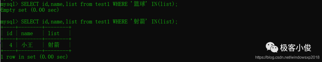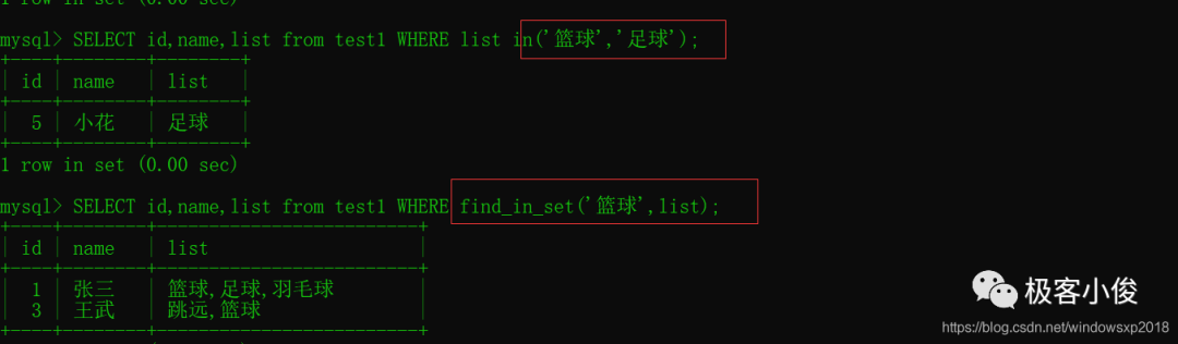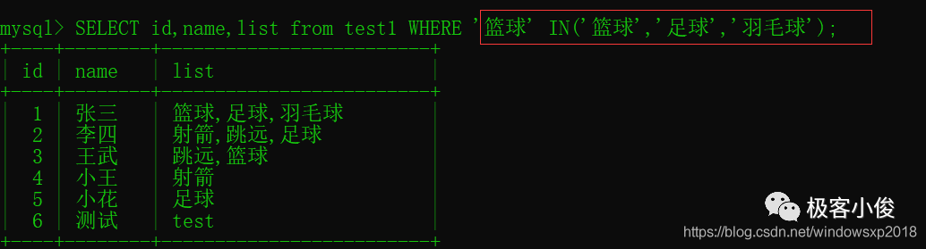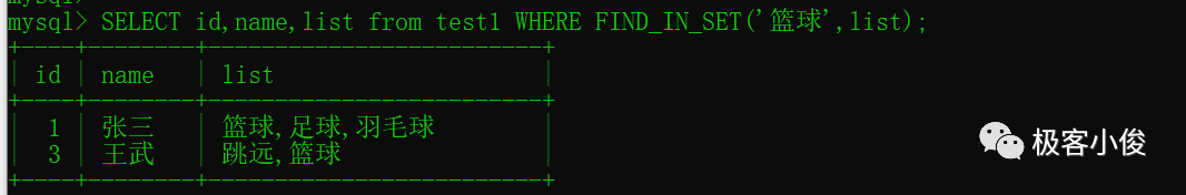 SELECT id,name,list from test1 WHERE find_in_set('篮球',list); #-- 返回list字段内容中包含了篮球的数据