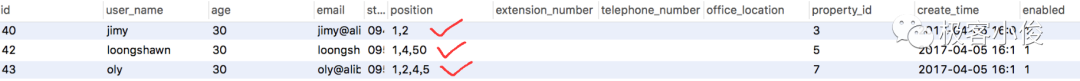 人有时会身兼数职,需要查找出其中担任某一职务的都有哪些人,如下面position字段,不同的职务用数字表示,多个职务以逗号隔开。其实跟上面的案例是一样的。如下表: User信息表