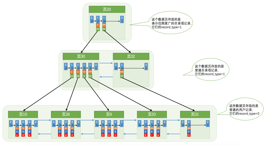 Mysql 与磁盘交互的最小单位是 Page, B+ 树 中存储的实际是一页一页的数据,下面这张图可以近似理解。