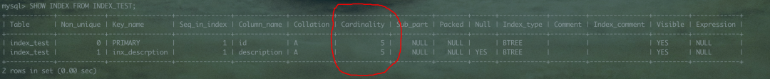 代表的是这个索引的数据唯一值的个数。现在表中有 5 行数据,并且 description