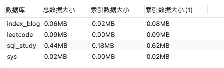 CONCAT( ROUND( SUM( ( ts.index_length + ts.DATA_LENGTH ) / 1024 / 1024 ), 2 ), 'MB' ) AS '索引数据大小'