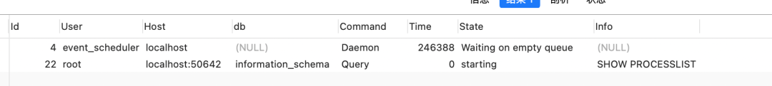 SELECT * FROM information_schema.`PROCESSLIST`;