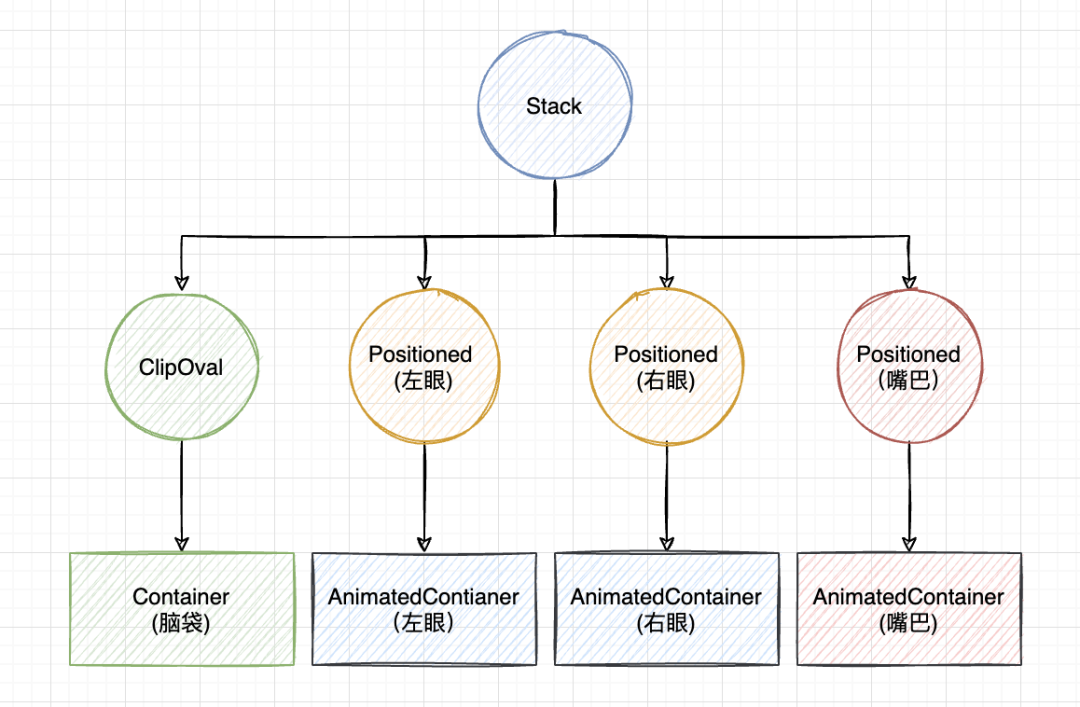 我们的笑嘻嘻动效,底部是一个圆形脑袋,上面有两颗眼睛和一个嘴巴,其中眼睛和嘴巴有移动动效,而眼睛的眼珠还有方向的动效。这些动效都可以使用AnimatedContainer