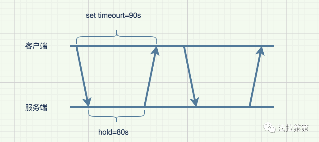 在上面长轮询的图中我们看到,客户端侧标注了一个timeout时间90s,服务端最长的hold时间是80s,两个时间只是个示例,代表的是服务端hold的时间要小于客户端设置的超时时间。这也很容易理解,如果服务端的hold时间大于客户端设置的超时时间,那么大概率客户端会出现timeout异常,这是非常不优雅的。