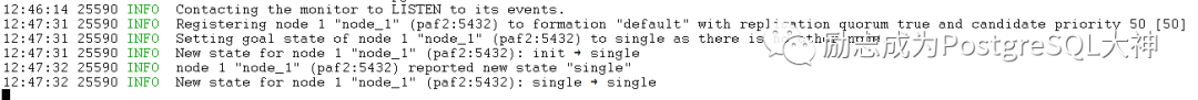 在PAF1节点主机上执行pg_autoctl查看状态,此时显示single。