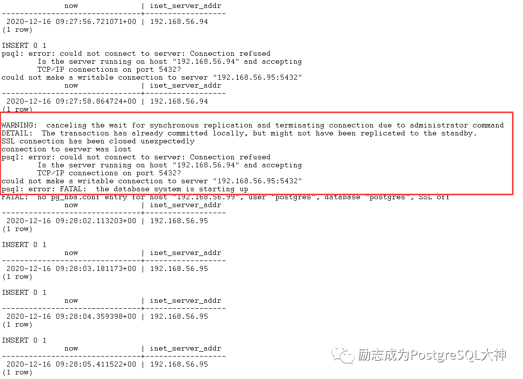[postgres@centos8 ~]$ psql 'postgres://192.168.56.94:5432,192.168.56.95:5432/postgres?target_session_attrs=read-write' \
