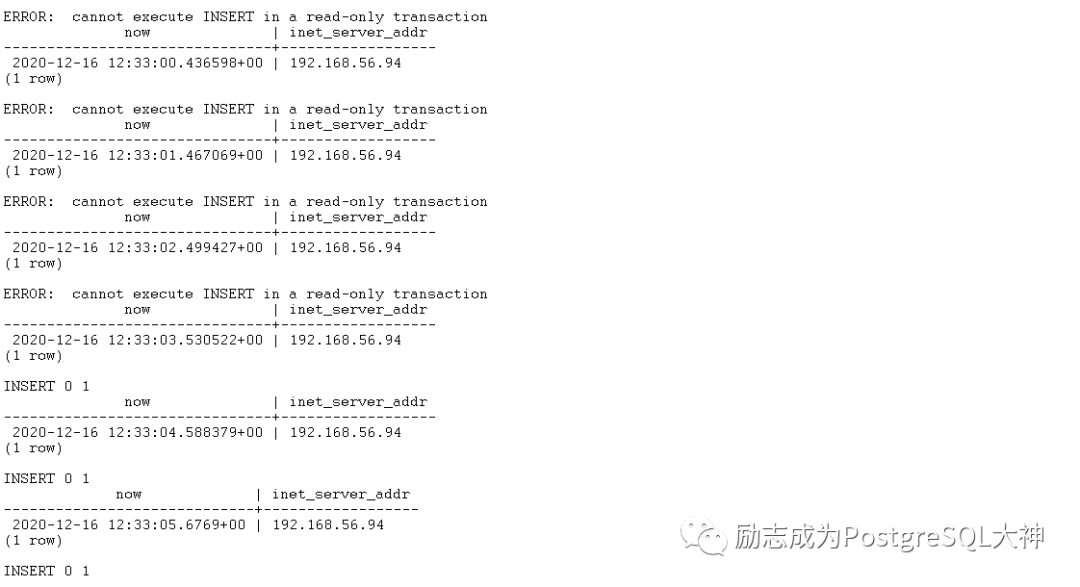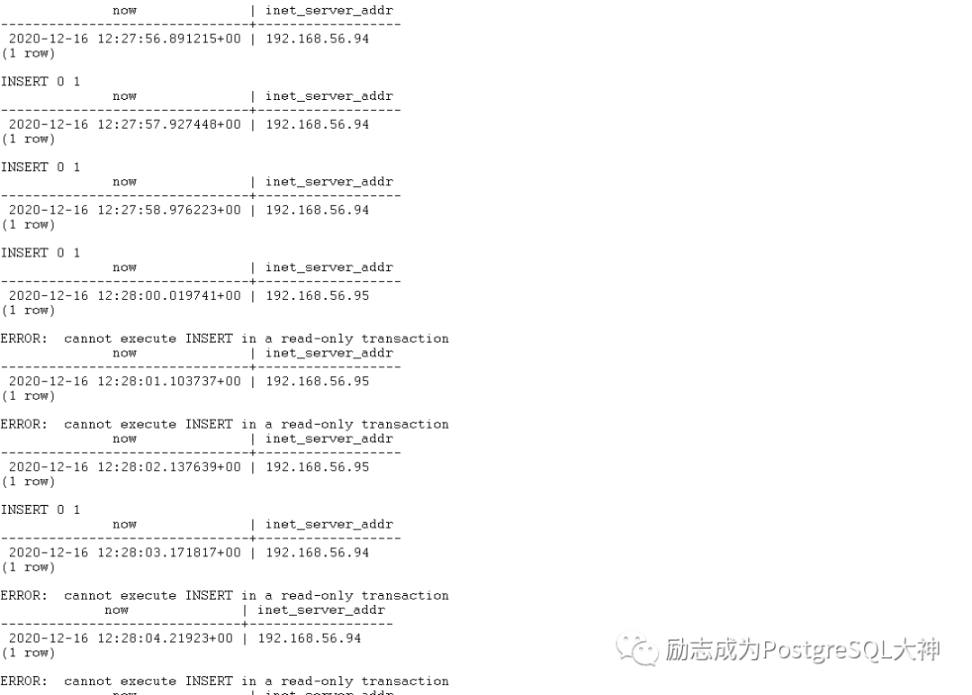 可以看到,客户端插入短暂出现1-2秒的异常。这是因为主从发生了切换。切换成功之后客户端仍然可以写入到从库,实现了客户端读写的连续性。