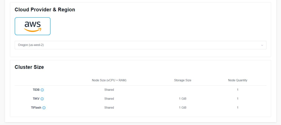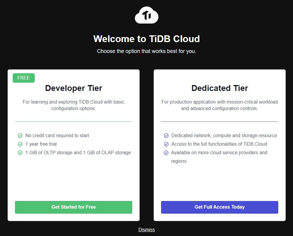 首先要注册TiDB Cloud,访问https://tidbcloud.com,可以选择左侧Free的资源(标记了使用期限、1G的OLTP存储和1G的OLAP存储,这个应该是对应到了Row-based storage for OLTP workload和Column-based storage for OLAP workload,即行式存储TiKV和列式存储TiFlash),土豪请向右看,