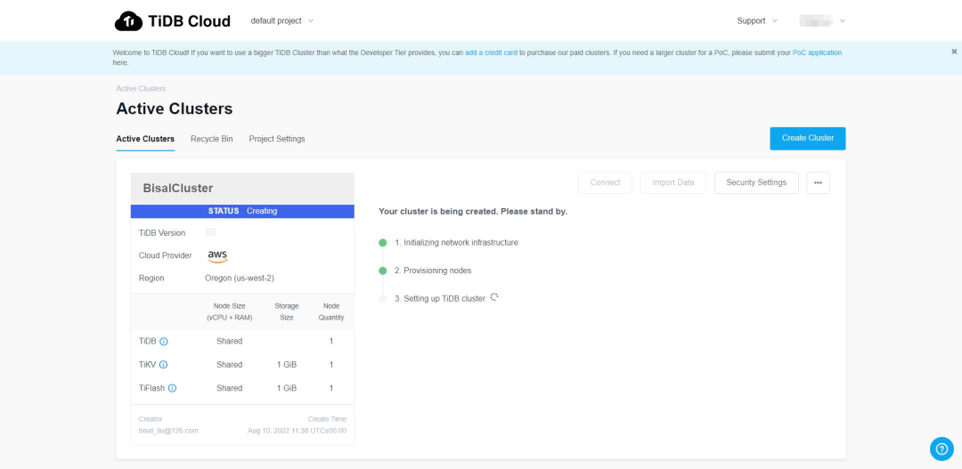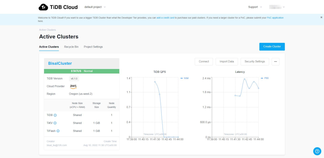 TiDB Cloud应该用的是AWS,所以连接起来,就会有些延迟,但是简单的测试,还是可以做的。