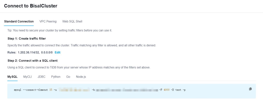 通过本机终端或者其他云主机作为跳板,利用MySQL Client软件,远程登录到TiDB,前提是能访问互联网,