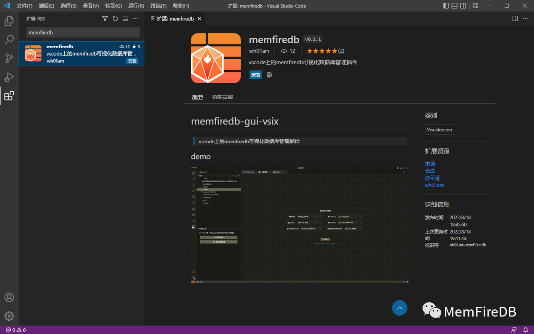 下载地址:https://marketplace.visualstudio.com/items?itemName=wh01am.memfiredb&ssr=false#overview