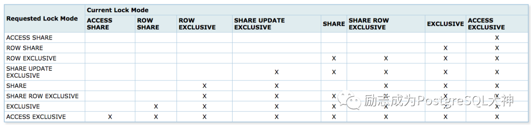 您也许会说我不是对表中行操作吗?怎样会是表级锁呢,这个我也有点疑惑。事实上,这些名字并不重要。官方文档中对此有一些解释。要记住所有这些锁定模式都是表级锁定,即使它们的名字中含有" row"(这是历史遗留问题)。